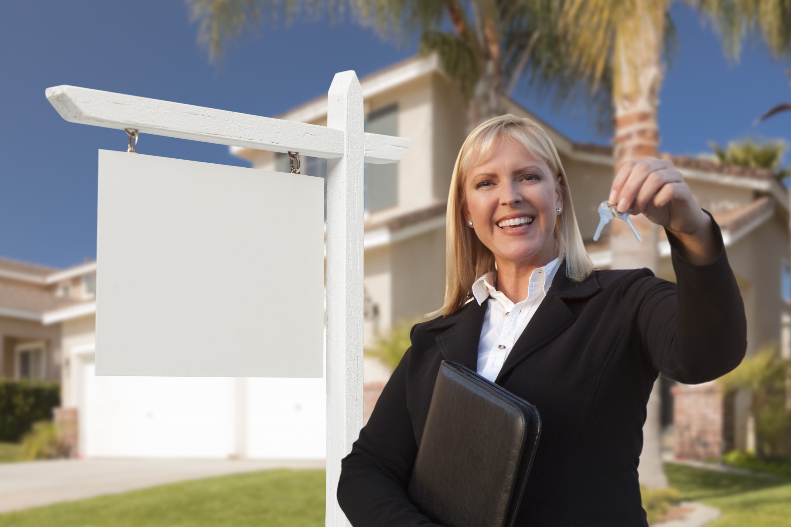 Female Real Estate Agent Handing Over the House Keys in Front of a Beautiful New Home and Blank Real Estate Sign.